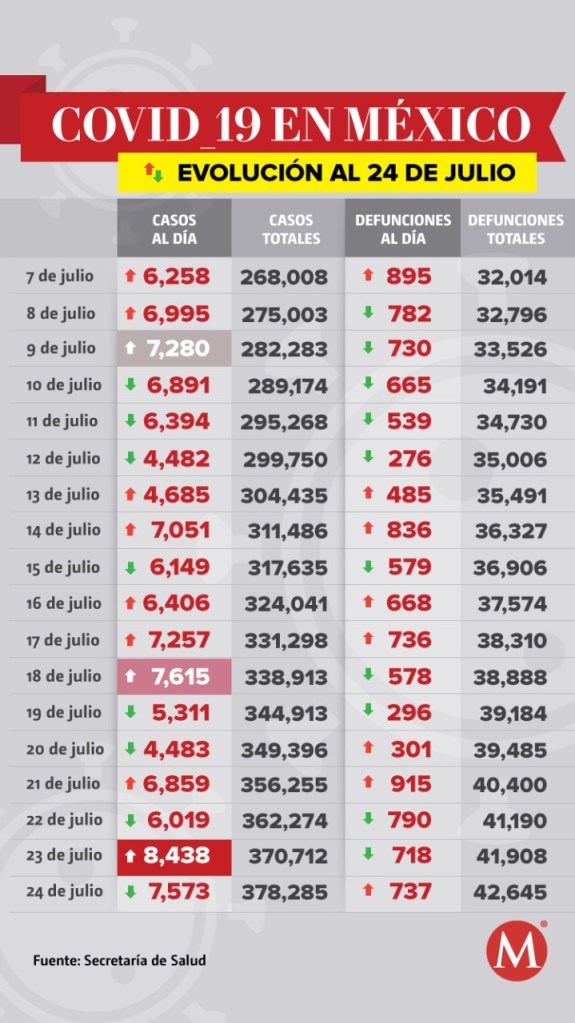 La Secretaría de Salud informó que al corte del 24 de julio México alcanzó 42 mil 645 muertes por coronavirus SARS-CoV-2 y acumula 378 mil 285 casos confirmados, de los cuales 426 mil 869 son negativos; además hay 90 mil 970 sospechosos.