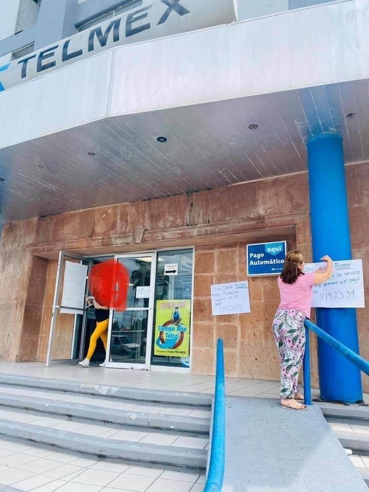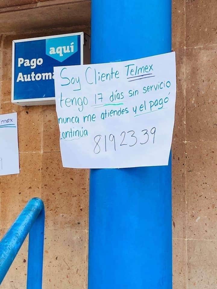 Una usuaria de la empresa Telmex lleva 17 días sin servicio y nunca la atienden, ante esos hechos, decidió colocar un anuncio afuera de las oficinas de la mencionada empresa.