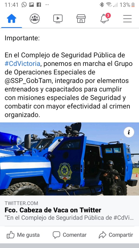 Francisco Cabeza de Vaca gobernador de Tamaulipas con bombos y platillos, ahora quiere que los ciudadanos aplaudimos, la creación de su grupo de delincuentes con charola que acaba de abanderar en Ciudad Victoria llamado Grupo de operaciones especiales de Tamaulipas ( GOET), el cual es uno más de sus partos para tratar de aminorar el reclamo popular en contra de la élite policial que el ha creado, y que a cometido abusos de poder, usurpación de funcionarios, uso excesivo de la fuerza, robo, secuestros, asesinatos en contra de pacíficos ciudadanos como los que comete El CAIET (centro de análisis e investigaciones especiales de Tamaulipas), que en repetidas ocasiones han sido denunciados, y se han asentado denuncias en las fiscalías generales de justicia de Tamaulipas, pero no han proliferado gracias a la mano negra del gobernador.