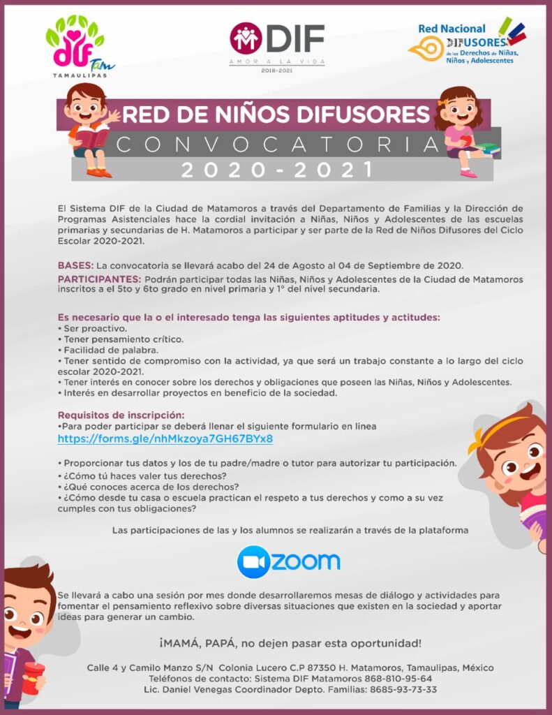 Para mayor información los padres de familia o directivos de las escuelas primarias o secundarias pueden comunicarse al 868-810-95-64 con el coordinador del departamento de Familias Daniel Venegas Tejeda, o de igual forma pueden aclarar cualquier duda al 868-593-73-33 y ser parte de la Red de Niños DIFusores 2020-2021.