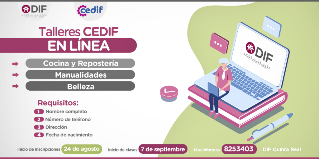 El Sistema DIF Matamoros que preside Marsella Huerta Sosa de López, invita a la población para que se integre a los talleres de capacitación CEDIF en línea de manualidades, belleza o cocina y repostería.