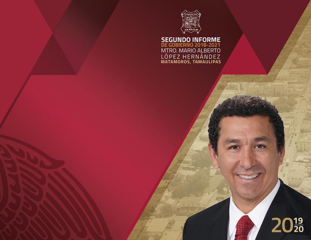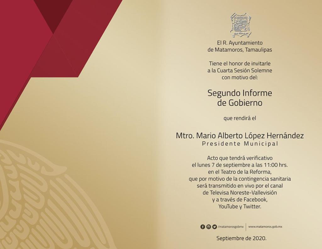 DE PARTE DEL ALCALDE MARIO ALBERTO LÓPEZ HERNÁNDEZ, DE MANERA MUY RESPETUOSA LOS INVITA A SU SEGUNDO INFORME DE GOBIERNO QUE POR MOTIVOS DE LA PANDEMIA POR COVID_19 SERA CERRADO AL PUBLICO Y LO PODRAN SEGUIR POR LAS PAGINAS OFICIALES DEL GOBIERNO DE MATAMOROS Y POR REDES SOCIALES. AGRADECEMOS SUS ATENCIONES