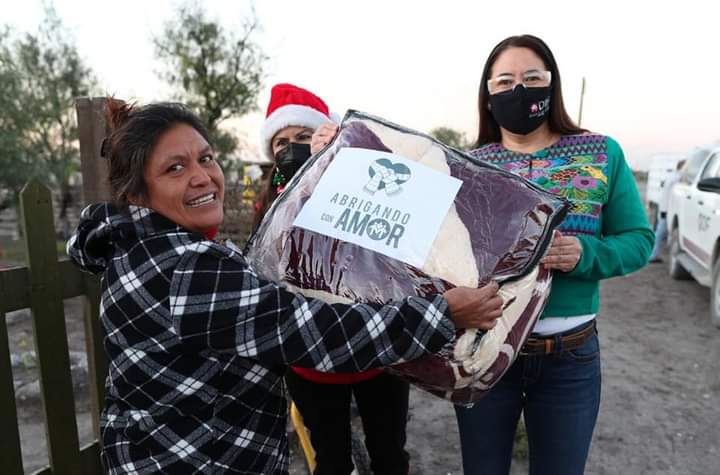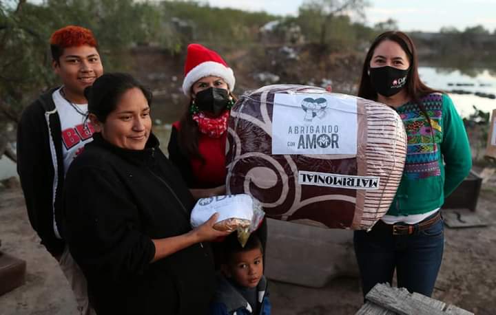 La Presidenta del Sistema DIF Matamoros hizo entrega de despensas, cobertores y cenas navideñas hasta la puerta de hogares vulnerables en la colonia Villa de Cortez como parte del programa Abrigando con Amor.