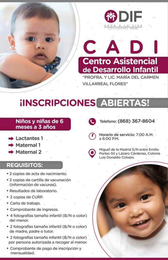 El sistema DIF Matamoros a través del Centro Asistencial de Desarrollo Infantil CADI “Lic. María del Carmen Villarreal Flores” te ofrece los servicios de guardería para niños y niñas de 6 meses a 3 años de edad, contamos con las siguientes salas: