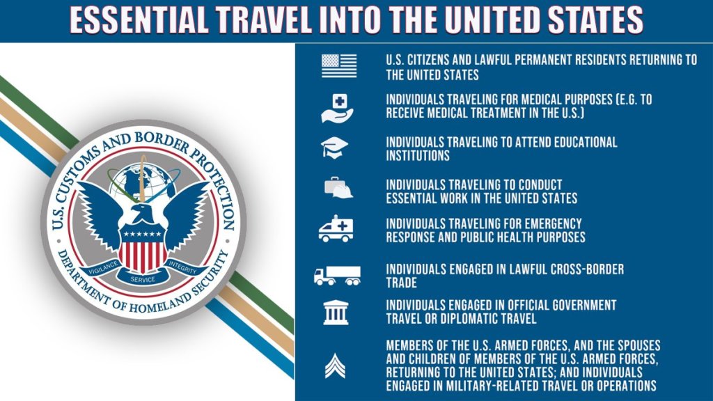 ALERTA DE VIAJE: La restricción temporal de viajes no esenciales en los puertos de entrada de la frontera terrestre de EE. UU. Permanece en vigor. Los viajes y el comercio esenciales continúan sin obstáculos. Los viajes esenciales incluyen, entre otros: https://t.co/WPs6D9B9pv