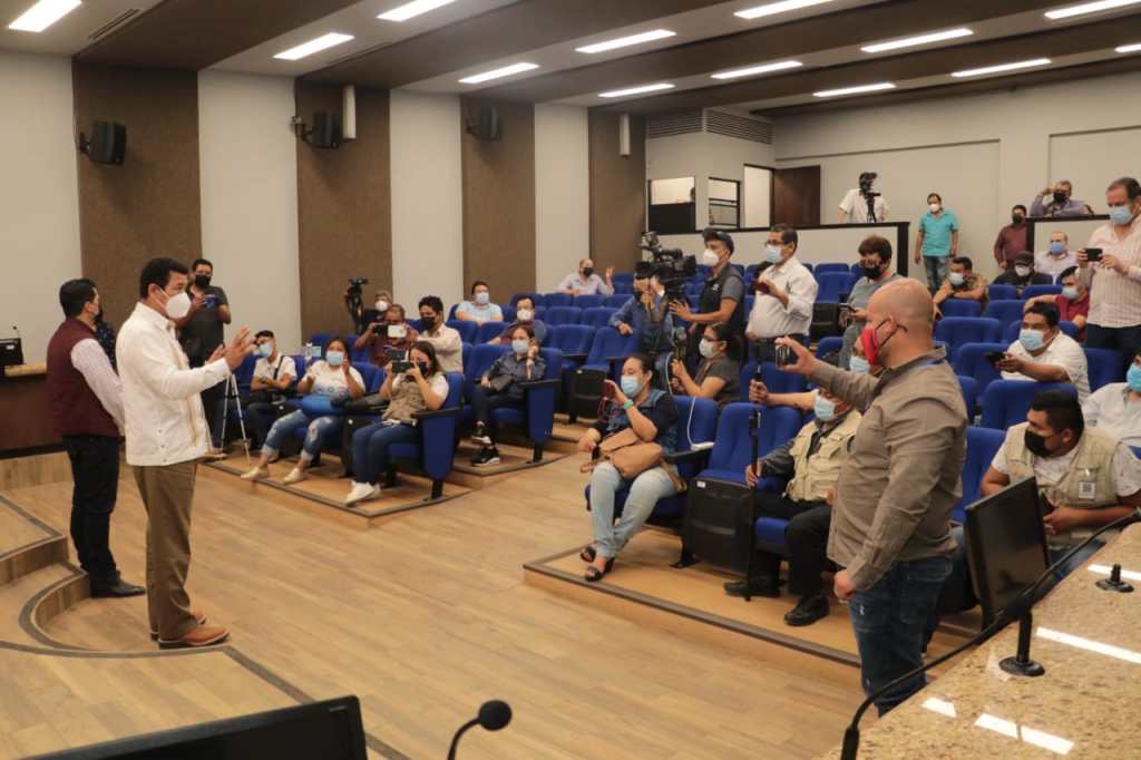 En conferencia de prensa el Presidente Municipal, acompañado del secretario del Ayuntamiento, Carlos Ballesteros Gálvez informó que en este proceso de vacunación participan los tres niveles de gobierno.
