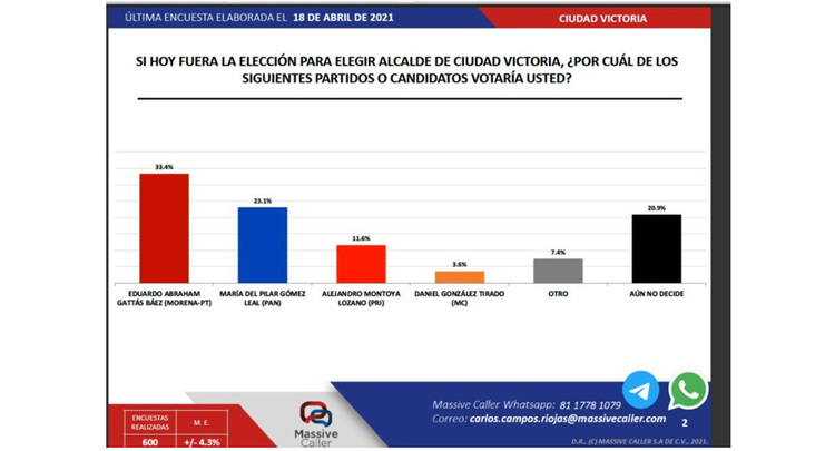 En el caso de Ciudad Victoria, el candidato de Morena, Eduardo Gattas Báez, tiene una intención de voto del 33.4 por ciento si la elección se realizara hoy. En segundo lugar, se encuentra la candidata del PAN, María del Pilar Gómez Leal, con una intención de voto del 23.1 por ciento, y en tercer lugar el candidato del PRI, Alejandro Montoya Lozano, con el 11.6 por ciento.