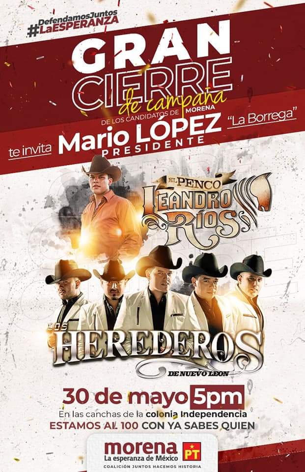 El candidato de la coalición “Juntos haremos Historia”, Mario López “La Borrega” invita al pueblo de Matamoros al gran cierre de la campaña de los candidatos de Morena, a realizarse el próximo domingo a partir de las 17:00 horas en las canchas de la colonia Independencia.