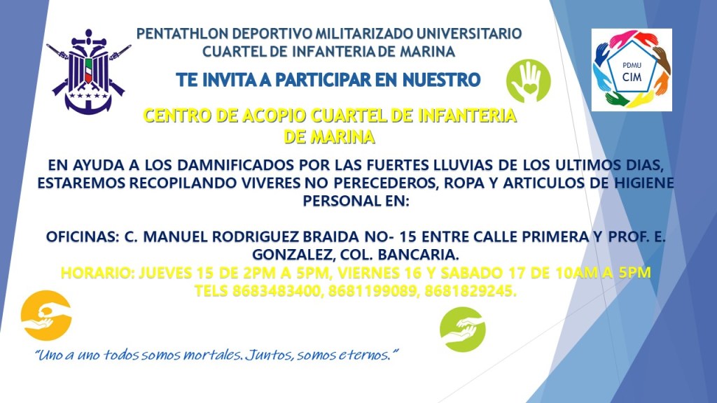 Cuartel de Infantería de Marina con su Centro de Acopio hace un llamado a toda población Matamorense a solidarizarse con nuestros hermanos afectados por las recientes inundaciones, que dejaron devastadas muchas áreas de nuestra ciudad y participar en la colecta para apoyarlos a quienes lo necesiten.