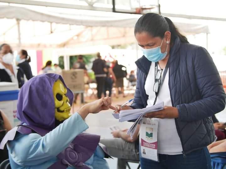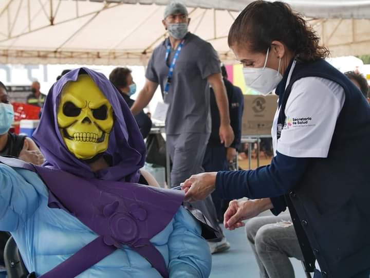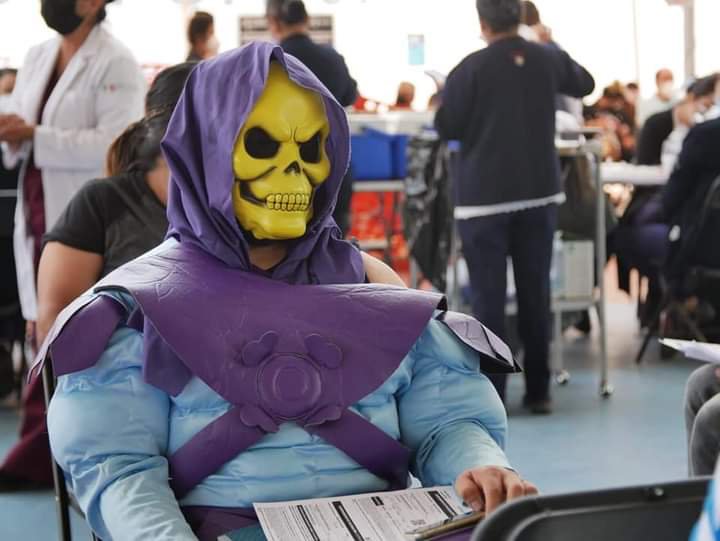 Tras iniciar la segunda dosis de vacunación en Morelia, Michoacán, un hombre se presentó con un disfraz del personaje de Skeletor, de la caricatura ochentera «He-Man, Masters of The Universe» http://eluni.mx/ve76b