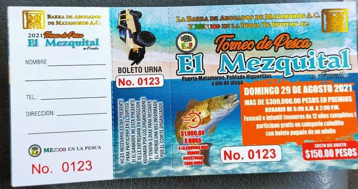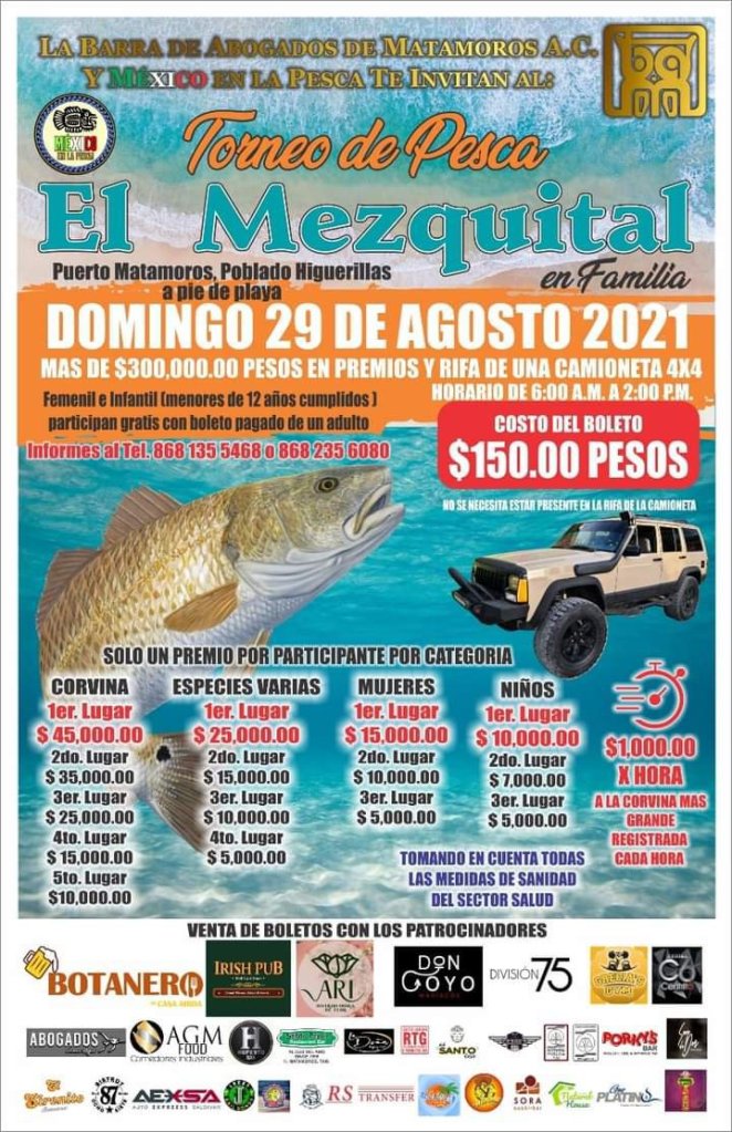 Te invitamos a disfrutar al Torneo Internacional De Pesca , Lugar Playa del puerto el Mezquital, poblado Higuerillas. Más de 300 mil pesos en premios, Rifa de una Cherokee 4×4, Niño menores de 12 años y Femenil gratis con boleto pagado de adulto. Informes y venta de Boletos 8681355468
