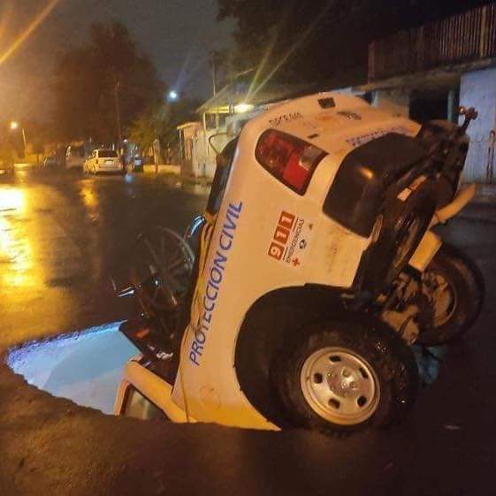 Nuevo Laredo -/ Elementos de la dirección de Protección Civil y Bomberos fueron rescatados por vecinos de un crucero de la colonia Viveros, tras ser “tragados” con todo y camioneta al venirse abajo el pavimento debido al reblandecimiento por las lluvias que azotaron a Nuevo Laredo en las últimas horas.