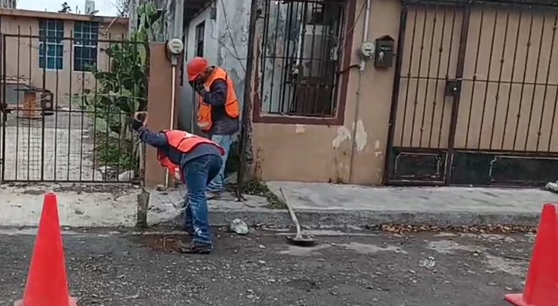 Esta otra fuga es en la calle Río Pánuco entre 8 y 11, donde personal de la empresa busca remediar la falla.