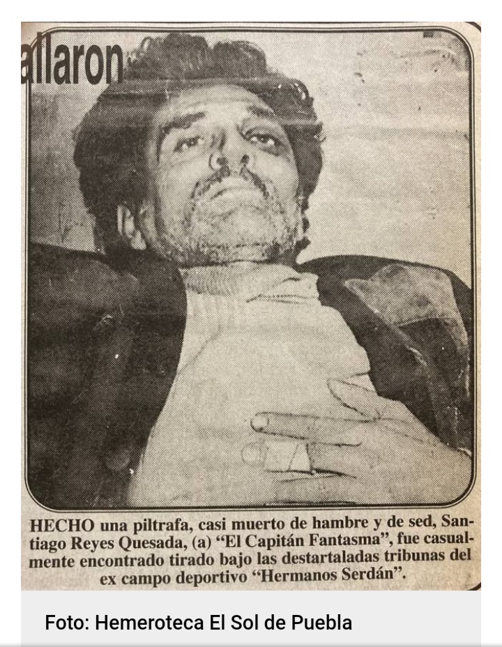 deshidratado, El Capitán Fantasma, fue descubierto tres días después de haber escapado del hospital, el 5 de enero de dicho año por el policía Isaías Cabrera Bautista. Fue hallado en el suelo debajo de las viejas tribunas de lo que fuera el campo de beisbol “Aquiles Serdán”, frente a las oficinas dela CFE en la 25 poniente entre la 13 y 15 sur.