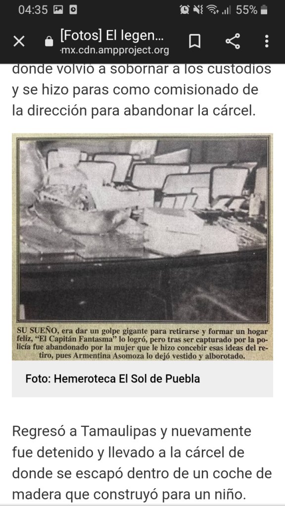 “Tenía órdenes de matarlo como a un perro de ser usted militar. Se salvó hijo de perra”, dijo el agente. Difundida la noticia de la captura del “capitán”, alguien preguntó ¿Cuál Capitán? Y el agente contestó: “el hampón ese, que vestido de capitán ha cometido tantas ching…; el ladrón ese que cada vez que robaba, se esfumaba como un fantasma. ¡Ah…!, exclamó alguien, entonces es un ´capitán fantasma´”(fuente: Hemeroteca El Sol de Puebla).
