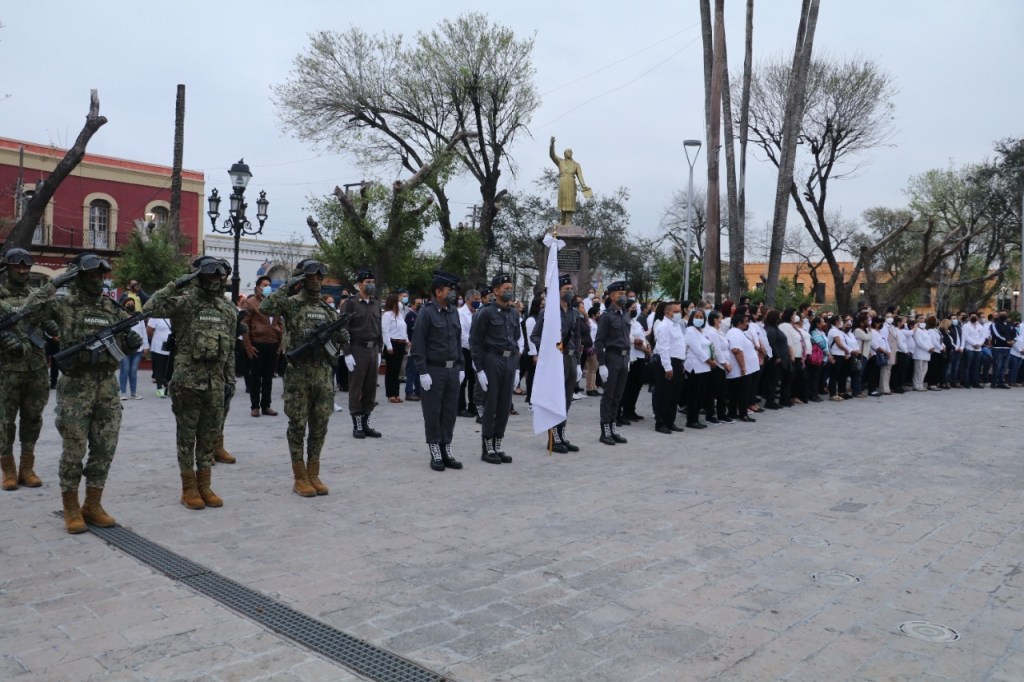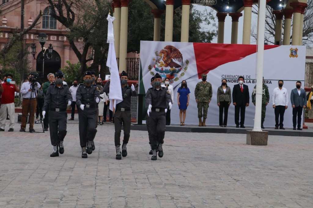 El izamiento de bandera correspondió a los elementos de la Marina; en tanto que la lectura de las efemérides, el valor del mes y juramento a la bandera, estuvo a cargo de directivos de la Secretaría de Desarrollo y Bienestar Social.