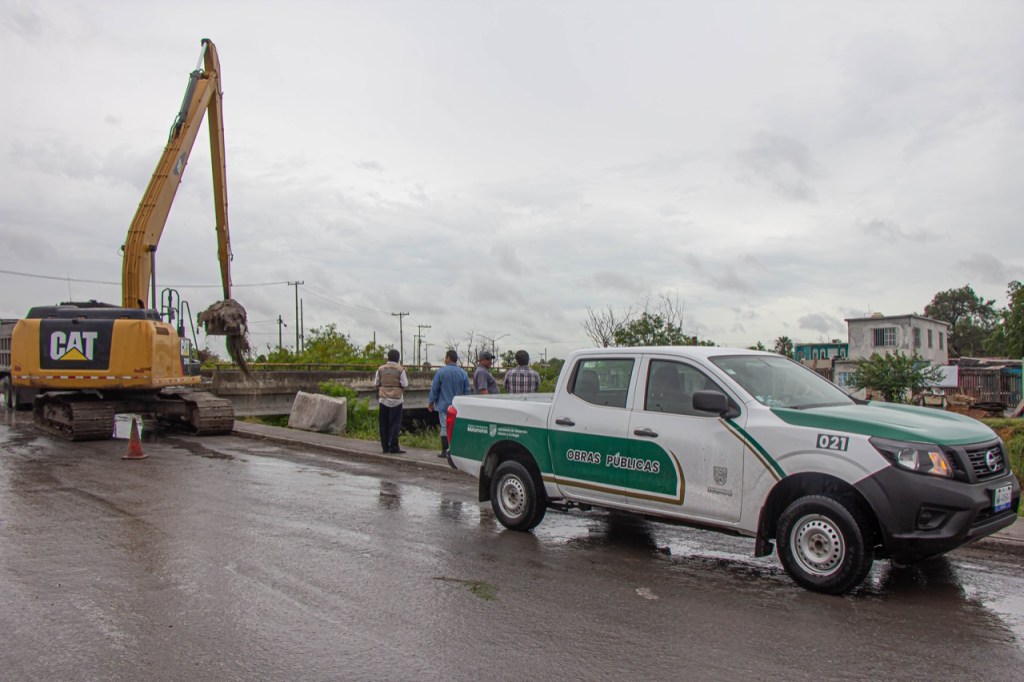 En auxilio a las familias que viven en colonias cercanas al Dren 20 de Noviembre, entre ellas, de la colonia Juárez, afectadas con la contingencia presentada en las primeras horas de este martes, el Municipio de Matamoros trabaja en la limpieza y desazolve del desagüe.