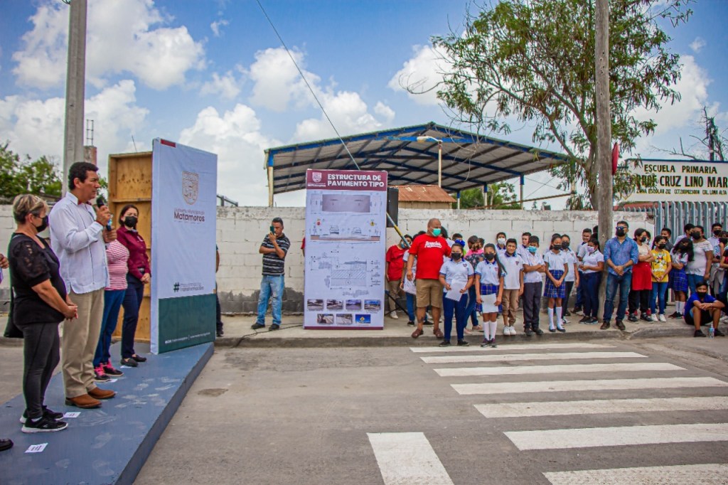 Al dirigirse a los vecinos, López Hernández dijo que el Gobierno de Matamoros está dando prioridad a la pavimentación de accesos a las escuelas, en un acto de justicia para que los niños ya no caminen más entre calles lodosas.