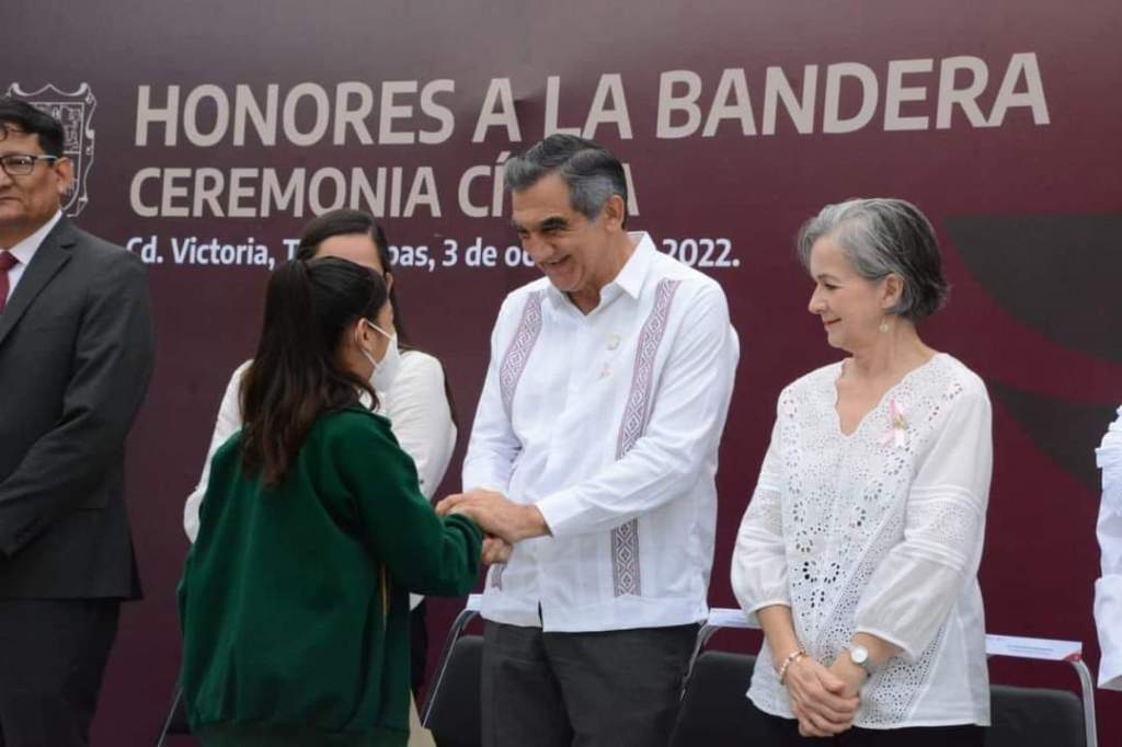 Cd. Victoria, Tamaulipas, 3 de octubre de 2022.- El gobernador Américo Villarreal Anaya presidió la primera ceremonia cívica de honores a la bandera y ante la estructura educativa del Estado, llamó a unir esfuerzos para combatir el rezago en el sector y que en Tamaulipas la educación sea verdaderamente transformadora.