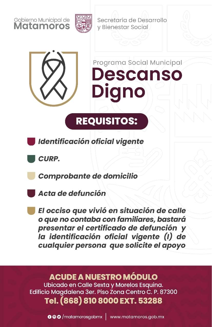 El Gobierno Municipal de Matamoros a través de la Secretaría de Desarrollo y Bienestar Social Matamoros, ponen a disposición de la población de matamoros el programa Descanso Digno, con él, se apoyará a las personas que se encuentren en situación vulnerable otorgando un ataúd por familia.