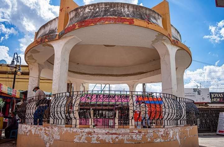 Este día los empleados trabajan en el pintado de barandales y estructura del kiosko de la citada zona comercial.