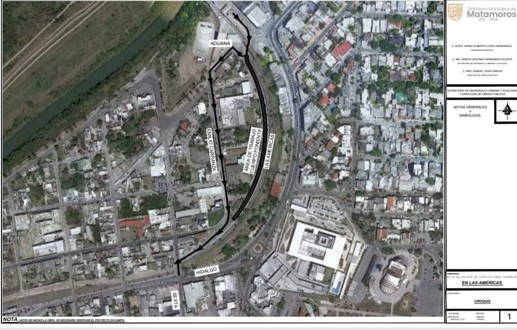A todas las personas que cruzan de Brownsville, Texas a Matamoros por el Puente Internacional B&M, conocido como Puente Viejo, el Gobierno Municipal les informa que debido a la realización de trabajos en la Avenida Las Américas, el carril poniente será cerrado a la circulación, ofreciendo como alternativa circular por la calle Emilio Carranza.