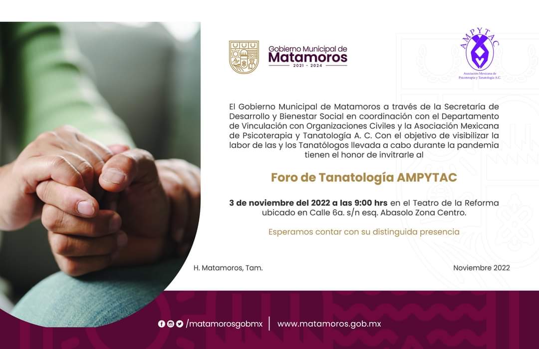 El Gobierno Municipal de Matamoros te invita al Foro de Tanatología, el cual se llevará a cabo el día 3 de noviembre a las 9:00 am, en el Teatro de la Reforma.