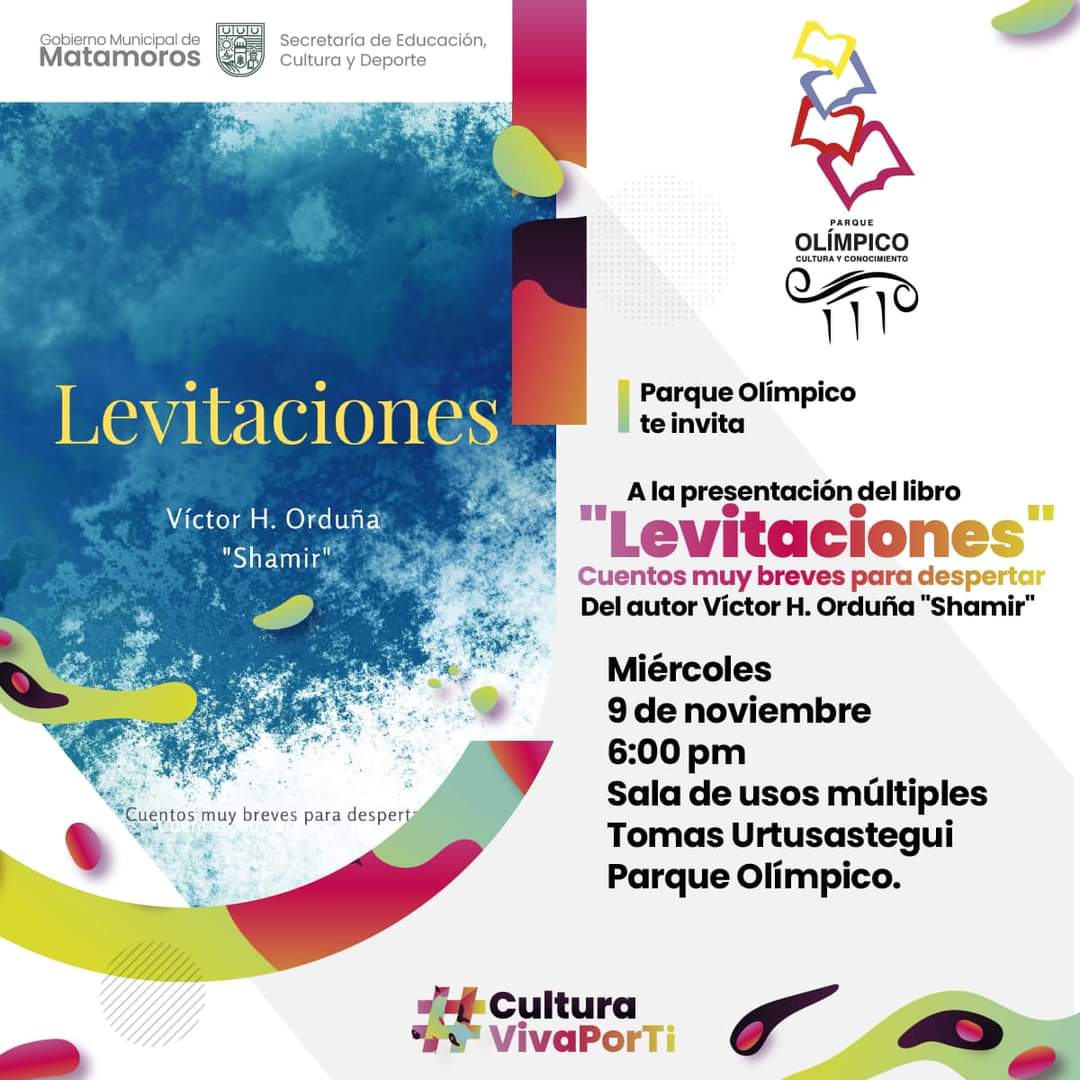 El Gobierno Municipal de Matamoros te invita a la presentación del libro «Levitaciones» cuentos muy breves para despertar del autor Víctor H. Orduña «Shamir Orduña»
