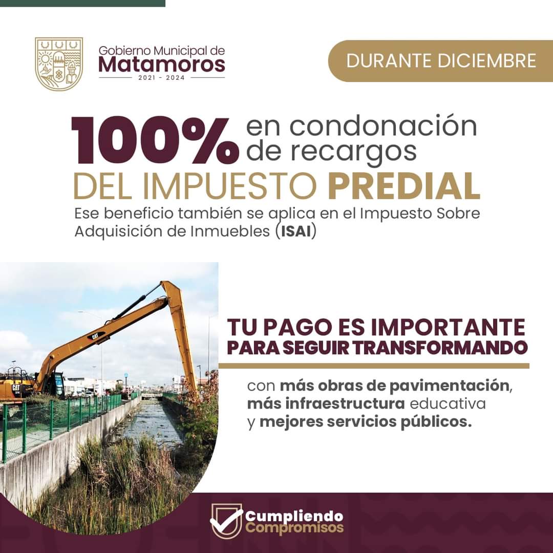 Durante el mes de Diciembre, el Gobierno de Matamoros mantiene la condonación del 100% de los recargos en el pago del Impuesto Predial Publicado porlaopiniondematamorosdiciembre 15, 2022Publicado en #GOBIERNO MUNICIPAL DE MATAMOROS, GOBIERNO MUNICIPAL DE MATAMOROS, Municipio Matamoros, noticia nacional e internacional, noticias de Tamaulipas, noticias regionales, periodismoEtiquetas:#gobiernomunicipal, #MATAMOROS, #MUNICIPIO, #municipiomatamoros Compártelo: Haz clic para compartir en X (Se abre en una ventana nueva) X Haz clic para compartir en Facebook (Se abre en una ventana nueva) Facebook Haz clic para compartir en WhatsApp (Se abre en una ventana nueva) WhatsApp Haz clic para compartir en X (Se abre en una ventana nueva) X Más Haz clic para compartir en Telegram (Se abre en una ventana nueva) Telegram Me gusta Cargando... Relacionado Publicado por laopiniondematamoros Soy Reportero Con más de 15 años de estar laborando en diferentes medios de comunicación. Ver más entradas