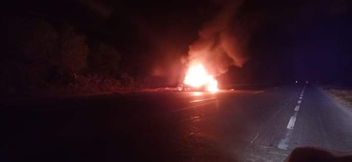 Reynosa, Tamaulipas.- Un vehículo particular se encuentra incendiándose a la altura del Ejido Palo Blanco, ubicado sobre el kilómetro 80 de la Carretera Federal 97 Reynosa-San Fernando.
