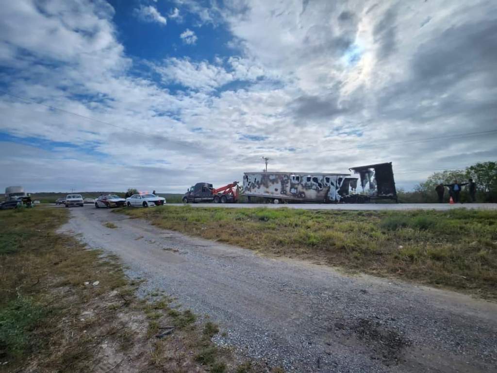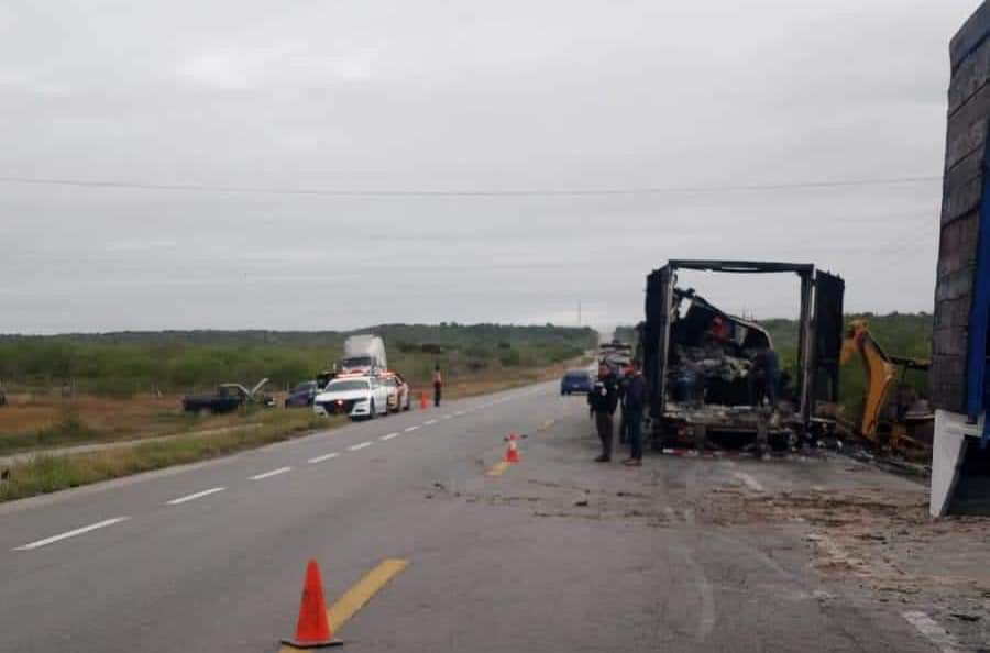 Jiménez, Tamaulipas.-Personal de la Guardia Estatal de Apoyo Carretero acudió en atención a un reporte por incendio de caja de tractocamión sobre la Carretera Federal 101 a la altura del kilómetro 102 en el municipio de Jiménez.