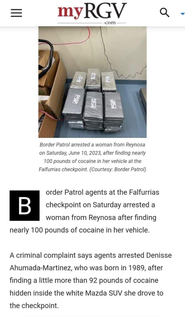 McAllen.- La Patrulla Fronteriza localizó casi 100 libras de cocaína en el vehículo del residente de una mujer identificada como Denisse Ahumada-Martínez, quien funge como regidora del PAN en el Municipio de Reynosa, de acuerdo con información divulgada por el portal noticioso “MyRGV” y fuentes noticiosas de Reynosa.