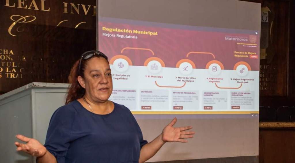 Integrantes de la Comisión de Estudios Reglamentarios en el Republicano Ayuntamiento de Matamoros y de la Dirección de Mejora Regulatoria ofrecieron una capacitación a servidores públicos municipales, con la finalidad de dar a conocer lineamientos para la mejora del catálogo reglamentario que rige a la administración pública municipal.