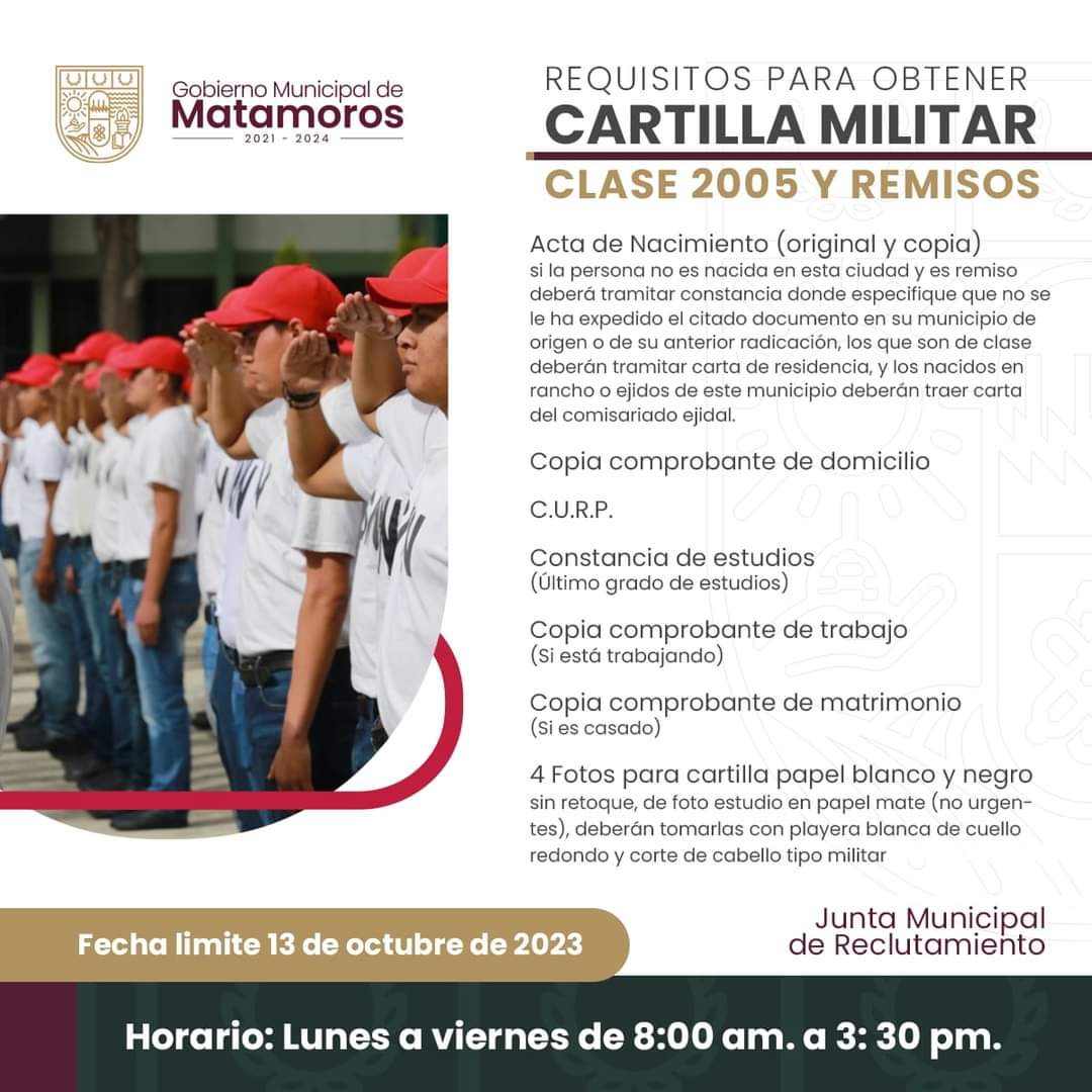 El Gobierno Municipal de Matamoros convoca a todos los jóvenes de la clase 2005 y remisos a realizar el trámite de su cartilla militar nacional.