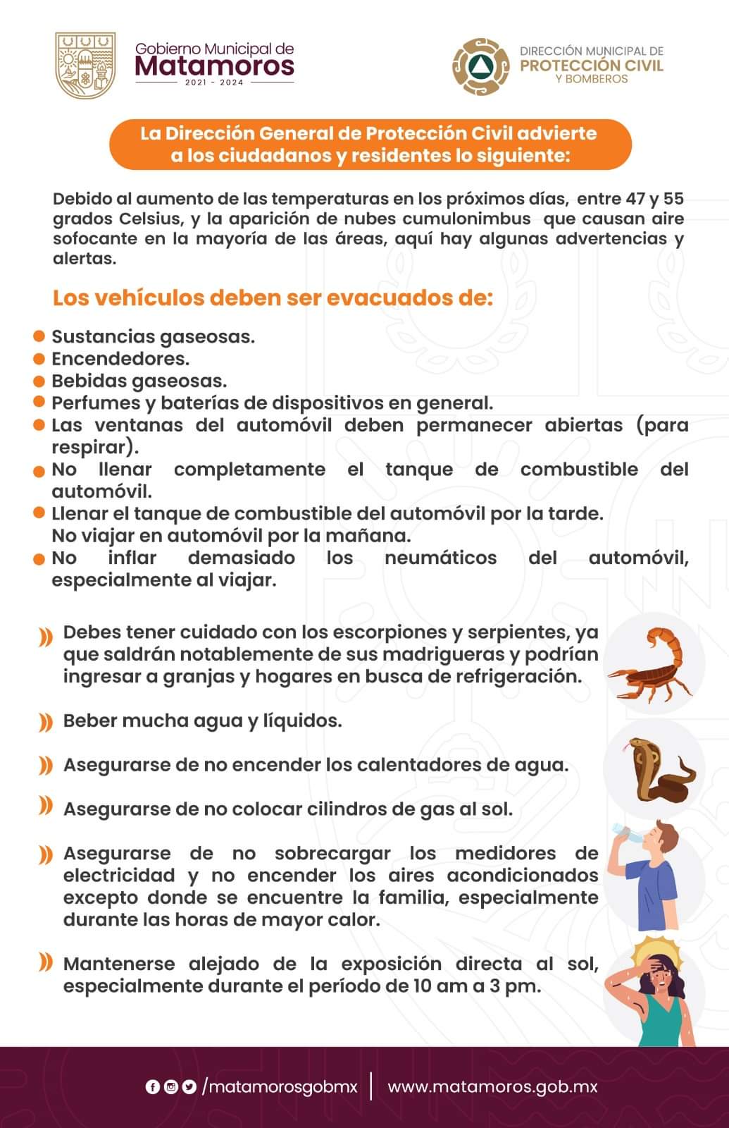Para cuidar de ti y tu familia el Gobierno Municipal a través de la Dirección de protección civil ha emitido las siguientes recomendaciones durante esta temporada de calor 🔥 🥵 Publicado porlaopiniondematamorosjulio 26, 2023Publicado en #GOBIERNO MUNICIPAL DE MATAMOROS, #MUNICIPIO, GOBIERNO MUNICIPAL DE MATAMOROS, Municipio Matamoros, notícias, noticia nacional e internacional, noticias de Tamaulipas, noticias regionales, periodismo, SALUD, Secretaria de Salud MunicipalEtiquetas:#gobiernomunicipal, #MATAMOROS, #MUNICIPIO, #municipiomatamoros, #SecretaríadeSaludMunicipal Compártelo: Haz clic para compartir en X (Se abre en una ventana nueva) X Haz clic para compartir en Facebook (Se abre en una ventana nueva) Facebook Haz clic para compartir en WhatsApp (Se abre en una ventana nueva) WhatsApp Haz clic para compartir en X (Se abre en una ventana nueva) X Más Haz clic para compartir en Telegram (Se abre en una ventana nueva) Telegram Me gusta Cargando... Relacionado Publicado por laopiniondematamoros Soy Reportero Con más de 15 años de estar laborando en diferentes medios de comunicación. Ver más entradas