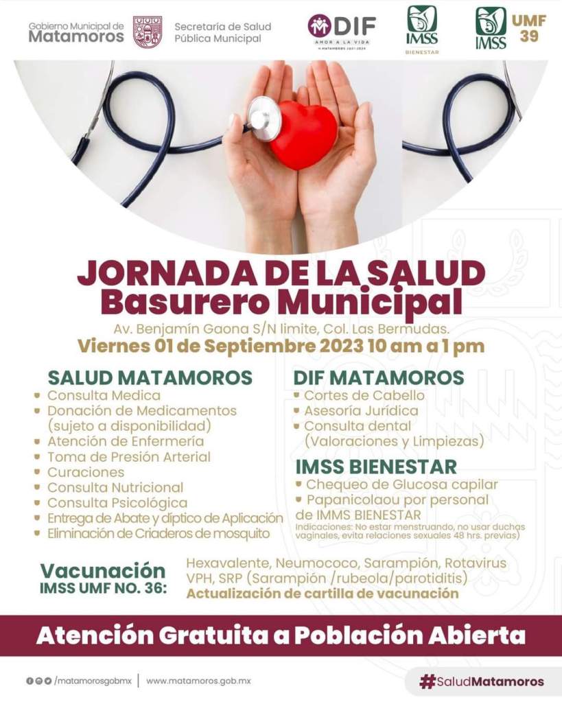 Gobierno de Matamoros, a través de la Secretaría de Salud Pública municipal, en colaboracion con DIF Matamoros e IMSS Bienestar, te invita:✨️¡A la gran brigada de servicios medicos y asistenciales que se llevara a cabo en el area del Basurero Municipal (col. Las Bermudas)Con servicios de:♦️Consulta Medica♦️Consulta psicológica♦️Consulta Nutricional♦️Chequeo de signos♦️Entrega de Abate♦️Asesoria Jurídica♦️Cortes de Cabello♦️Entre muchos más¡Todo esto totalmente gratuito!Siempre con la gestión del titular de la Secretaria de Salud Pública Municipal, el Dr. Victor García Fuentes.