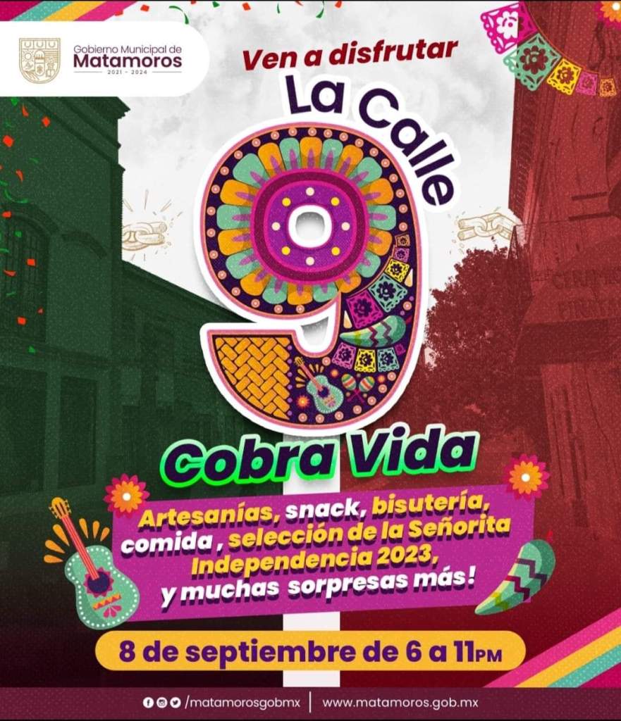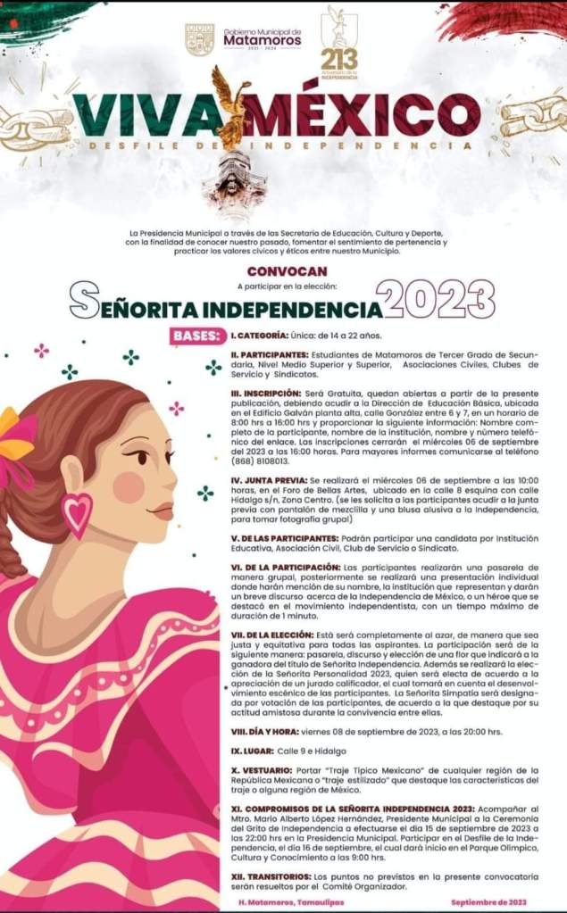 Gobierno Municipal de Matamoros a través de la Secretaría de Desarrollo Económico y Turismo en coordonación con la Secretaría de Educación, Cultura y Deporte.Te invitamos a la Callejoneda el Viernes 08 de Septiembre.Se realizára la selección de la SeñoritaIndependencia 2023.Para mas información comunicarse a: Dirección de Educación Básica 86 88 10 80 13.