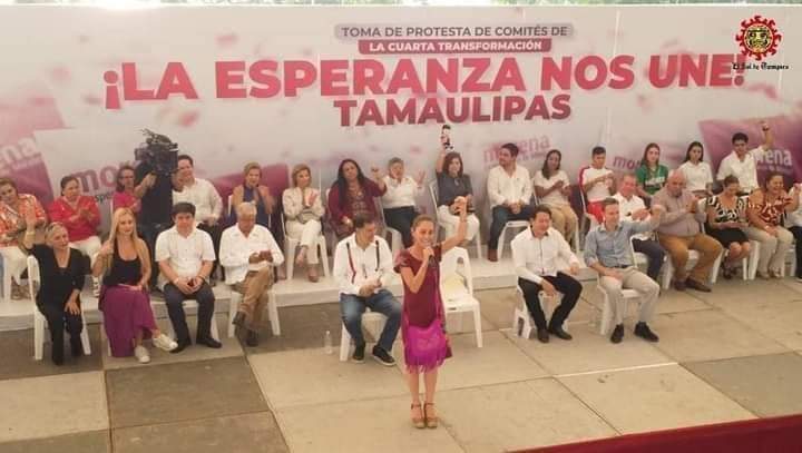 En el recinto ferial de Tampico, Sheinbaum encabezó el acto de toma de protesta de los nuevos dirigentes del comité municipal de Morena, donde estuvo acompañada por el presidente nacional del partido, Mario Delgado.