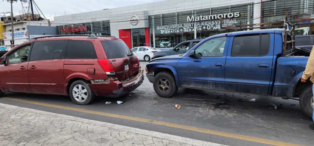 En el percance están involucrados una camioneta Dodge Dakota de color azul, una camioneta cerrada color rojo, Nissan Quest, un carro Chevrolet color blanco y una camioneta Honda.