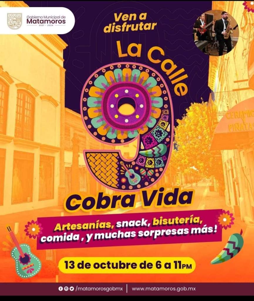 Te Esperamos el Viernes 13 de Octubre del 2023 en La Calle 9. Publicado porlaopiniondematamorosoctubre 10, 2023Publicado en #GOBIERNO MUNICIPAL DE MATAMOROS, #MUNICIPIO, GOBIERNO MUNICIPAL DE MATAMOROS, La secretaria de educación, cultura y deporte, Municipio Matamoros, notícias, noticia nacional e internacional, noticias de Tamaulipas, noticias regionales, periodismoEtiquetas:#educacionmunicipal, #MATAMOROS, #Secretariadeeducaciónmunicipal Ven a divertirte con la Familia. En el escenario: Ensamble de Jazz( Festival de Otoño). RockDRigo González ( Balcón de Lizam ArteEstudio). Compártelo: Compartir en X (Se abre en una ventana nueva) X Comparte en Facebook (Se abre en una ventana nueva) Facebook Compartir en WhatsApp (Se abre en una ventana nueva) WhatsApp Compartir en X (Se abre en una ventana nueva) X Más Compartir en Telegram (Se abre en una ventana nueva) Telegram Me gusta Cargando... Relacionado Publicado por laopiniondematamoros Soy Reportero Con más de 15 años de estar laborando en diferentes medios de comunicación. Ver más entradas