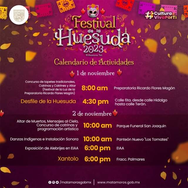 El Gobierno Municipal de Matamoros te invita a disfrutar del calendario 🗓️ de actividades que el “Festival de la Huesuda 2023” trae para ti.