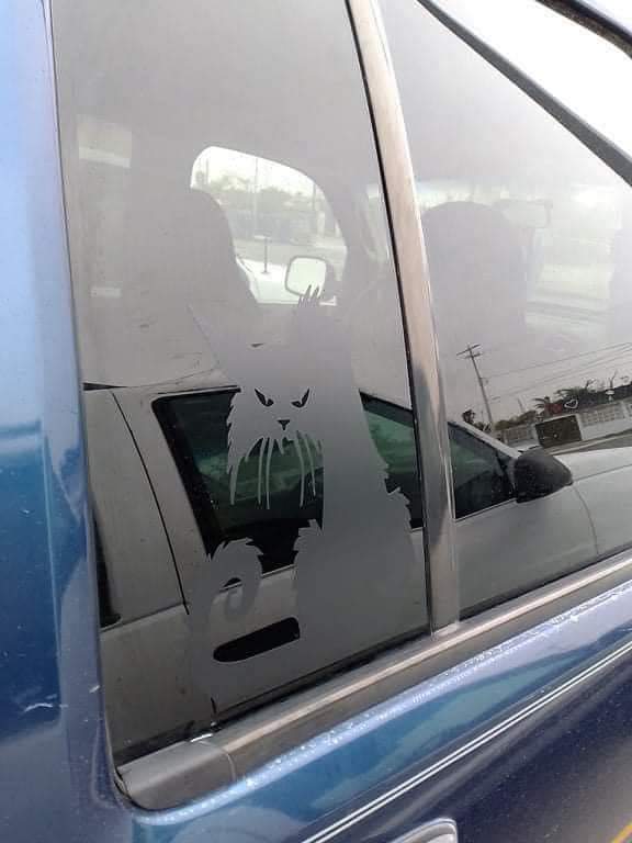 Cómo seña particular tiene una estampa de un gato en la ventana trasera del lado del copiloto y tiene placas con el número DR3-Z686 del estado de Texas.