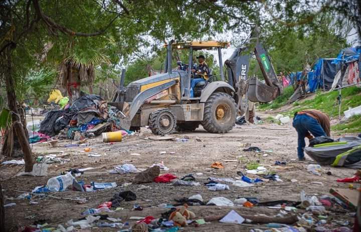 Con el fin de evitar problemas de salud pública, autoridades municipales de Matamoros procedieron a la limpieza del bordo del río bravo, en donde los migrantes han dejado sus casas de campaña abandonadas, así como ropa usada y otros utensilios tirados.