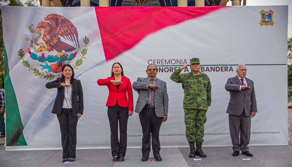 Autoridades municipales, civiles y militares participaron este lunes en la ceremonia de honores a la Bandera organizada por el Municipio de Matamoros a través de la Secretaría de Educación, Cultura y Deporte en coordinación con la Secretaría de Bienestar Social.