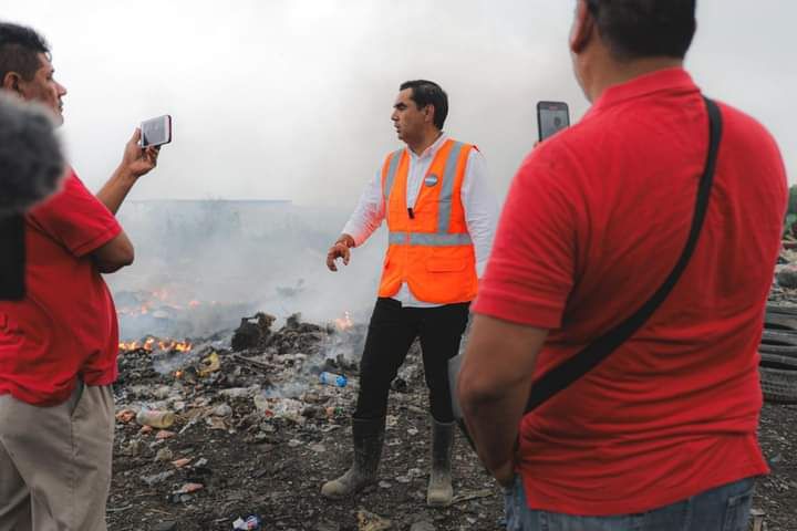 Apesar de que el candidato naranja iba a llevar acabo un desazolve de aguas negras, cambió la agenda inicial cuando en su vista se atravesó el tiradero clandestino consumido por el fuego.