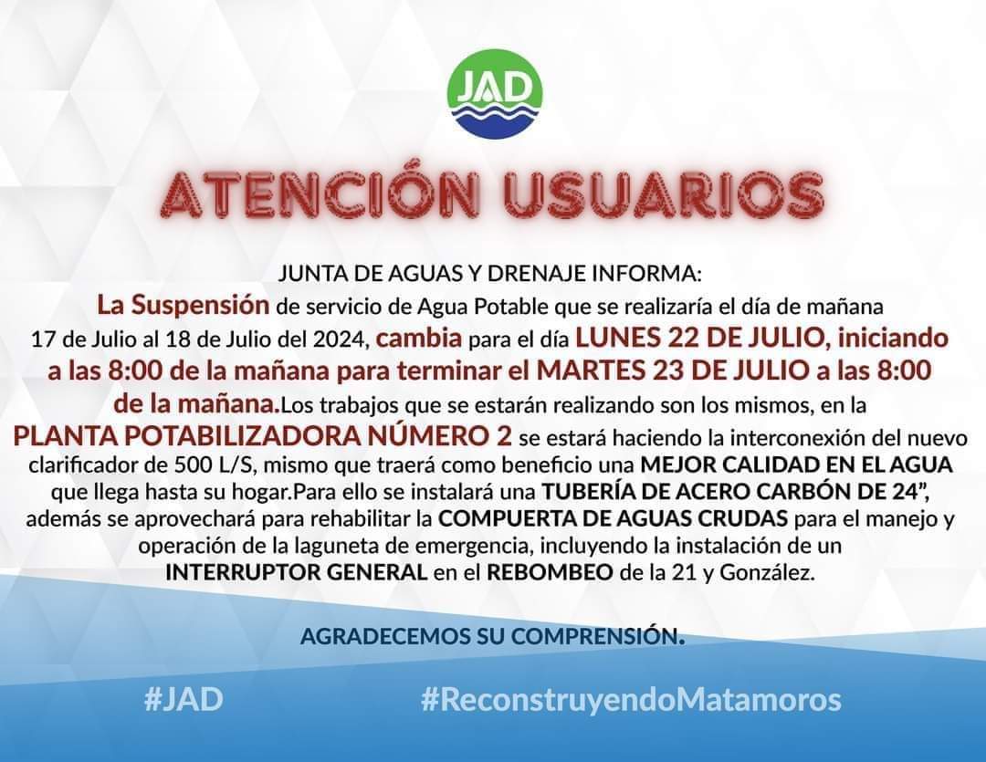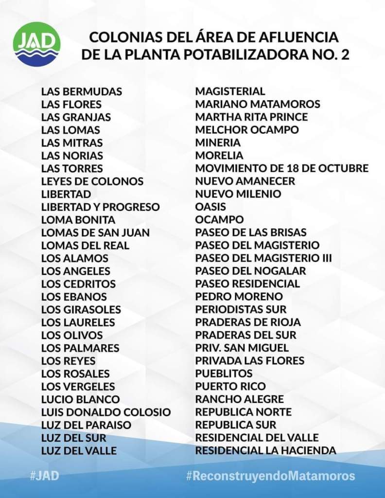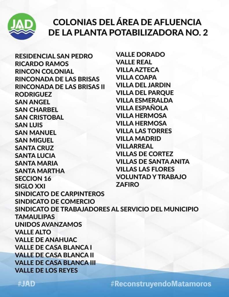 La suspensión del servicio de agua potable en la PLANTA 2, es mañana LUNES 22 de julio iniciando a las 8:00 de la mañana para concluir el MARTES 23 DE JULIO a las 8:00 de la mañana. Aquí la lista de las colonias que se verán afectadas 👇🏻