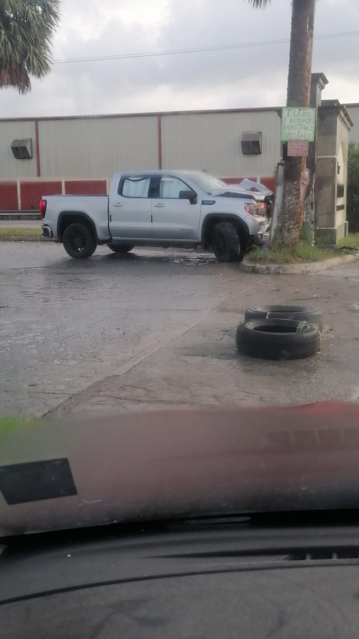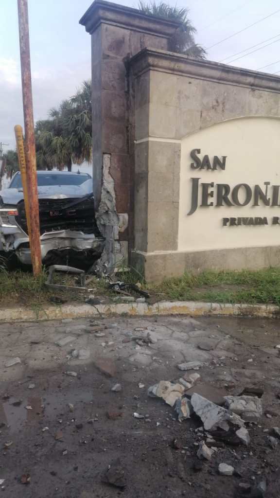 Esta mañana autoridades de tránsito se trasladaron a la entrada del fraccionamiento Jardines de San Jerónimo donde se localizo una camioneta impactada en el anuncio de concreto de la entrada a dicho lugar.