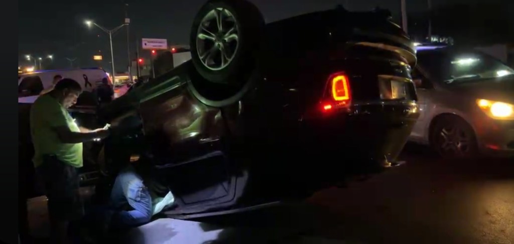 Residente de lado americano bien enwiskado pierde el control de su camioneta y termina la unidad volcada a la altura de la avenida Lauro Villar y Fidencio Trejo.