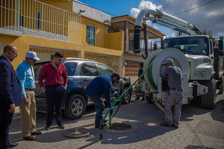Durante el recorrido, el alcalde constató el uso de camiones vactor, equipo especializado para la limpieza y mantenimiento del sistema de drenaje, con el objetivo de prevenir inundaciones y mejorar el flujo en las redes de agua y drenaje de la ciudad.