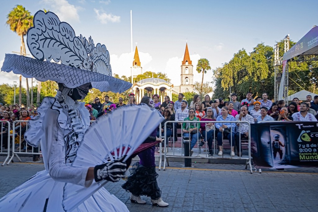 Instituciones de educación medio superior y superior desfilaron sobre el primer cuadro de la ciudad, mostrando trajes y bailes tradicionales de la festividad de Día de Muertos.